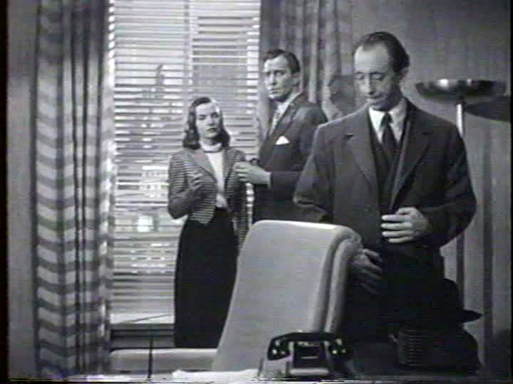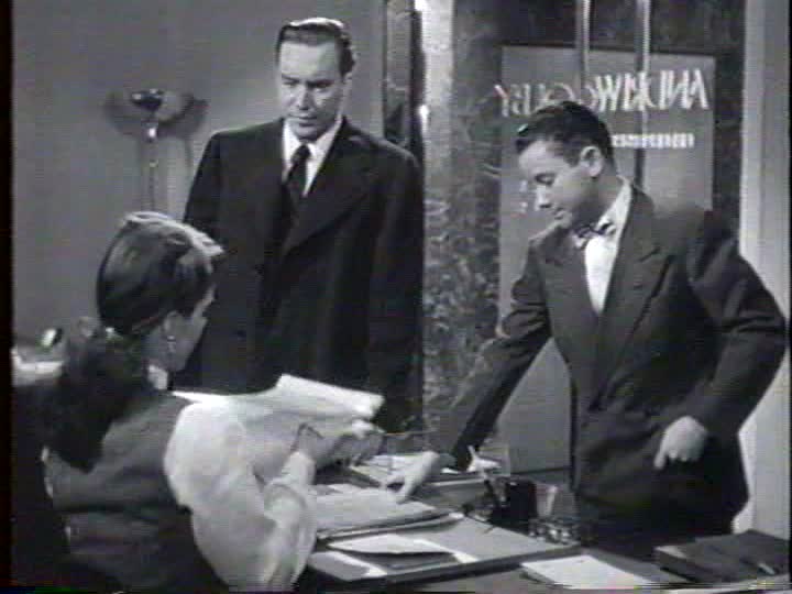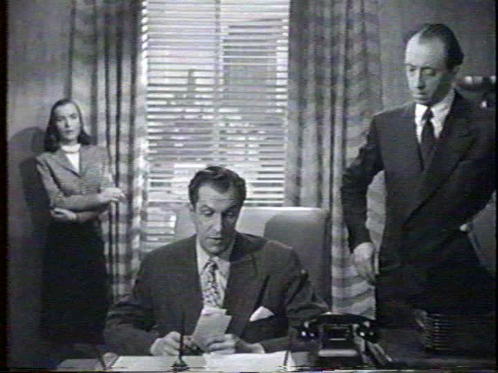 Both are trying to visualize the same thing: the milieu of the upscale, modern Manhattan office. Both use white-washed studio-set walls with occasional furnishings (doorframes, plants, lamps, signs) to give the illusion of a more luxurious decor. But Gentleman's Agreement uses not only a more complicated scene coverage but also a lighting scheme/lens choice that gives the illusion of depth and of a sense of space. The difference reflects the gap between the high A and the near-B. Universal was upgrading itself at this point, sometimes with stylistic verve, but here it could put more emphasis on script than shooting and in any case had difficulty competing in the same leagues as Fox. That is not to say that cheapness was merely simple. Much as in David Bordwell's description of classical blocking, the arrangement of characters in the frame communicates the narrative subtext of the scene, in which the romantic pairing between the Ella Raines and Vincent Price characters gets interrupted by the confidant who introduces the plot line of an embezzler released from prison. Raines remains in the background, outside of the dealings between the men, yet clearly affected and concerned by them. This will foreshadow her position in much of the narrative.